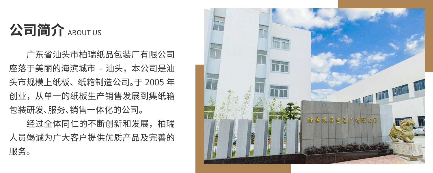汕头市柏瑞纸品包装厂有限公司网站 正式上线! 广东省汕头市柏瑞纸品包装厂有限公司座落于美丽的海滨城市-汕头,本公司是汕头市规模上纸板、纸箱制造公司。 公司生产的瓦楞包装纸箱质量稳定,为国内外众多知名企业选用、配套,覆盖了家用、食品、饮料、冷冻、日用品、玩具等众多领域,获得众多优秀供应商、优秀配套企业称号。